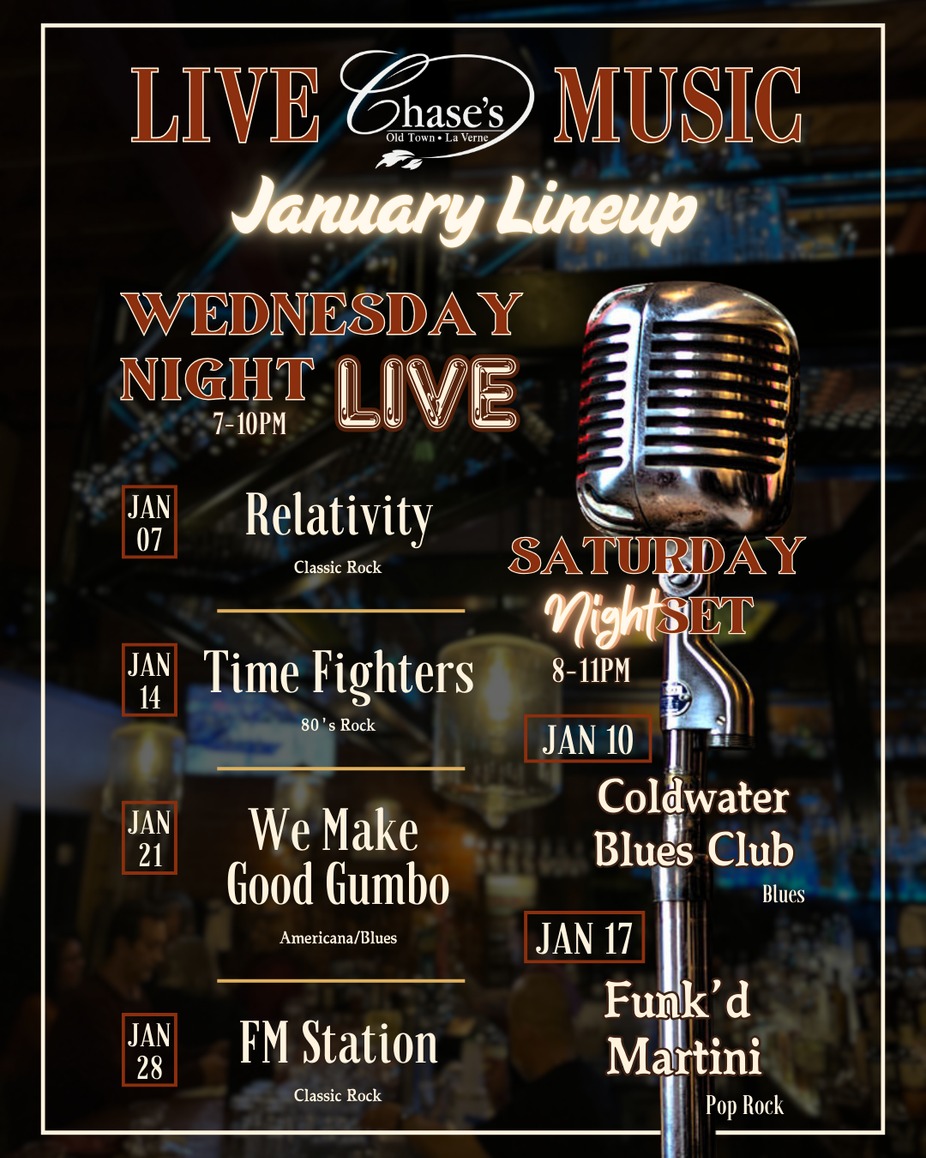 Chase’s Live Music Line up for January is looking (and sounding!) absolutely stellar. Join us for all these amazing acts!