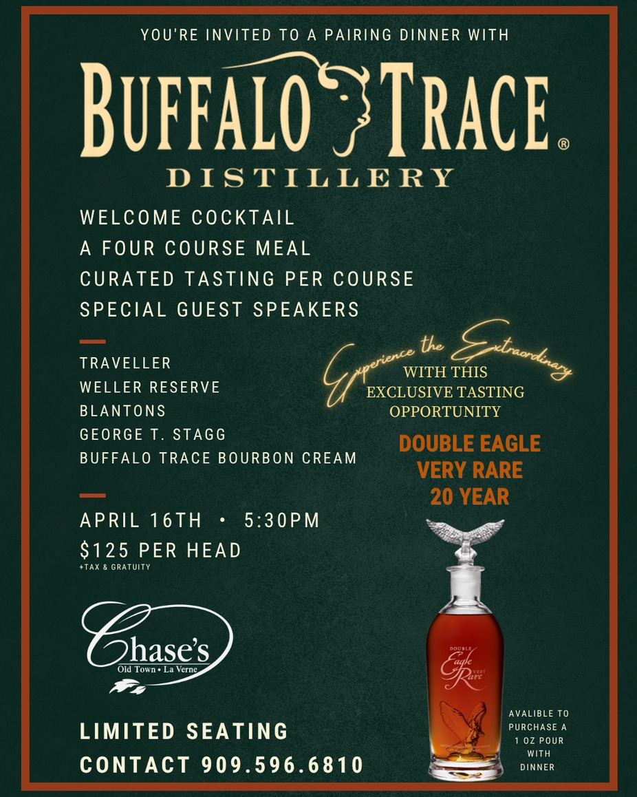 We are proud to host an exclusive pairing dinner with Buffalo Trace Distillery on April 16th. Join us for a curated four-course meal, with each course specifically designed to complement a hand-selected tasting.
